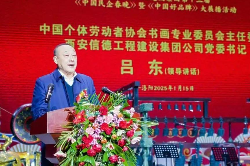 本届《中国民企春晚》活动总冠名:西安信德工程建设集团有限公司党委书记吕东在致词中说:第十三届《中国民企春晚》是在“新时代、新征程、新发展”的精神鼓舞下,是在我国人民为建设中国式现代化强国再立新功的背景下进行的,他代表《光彩》杂志社、中国个体者劳动协会书画专业委员会对来自全国各地的民营企业家们表示诚挚的感谢与热烈的欢迎。